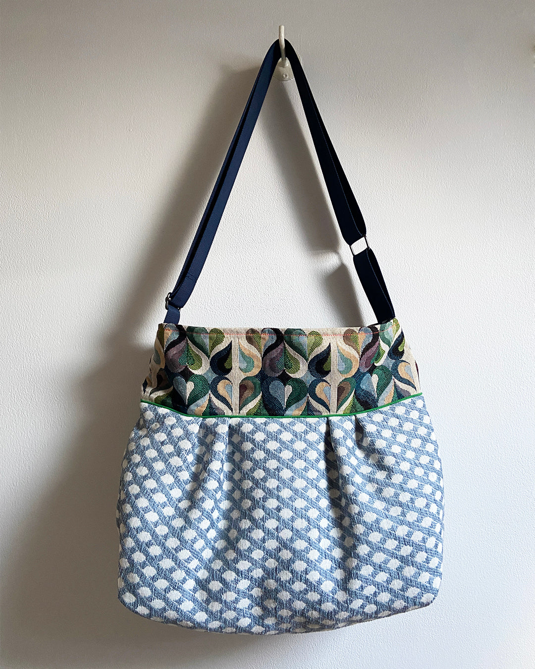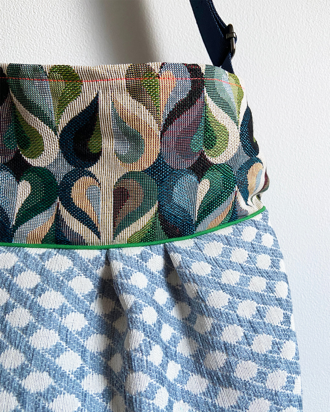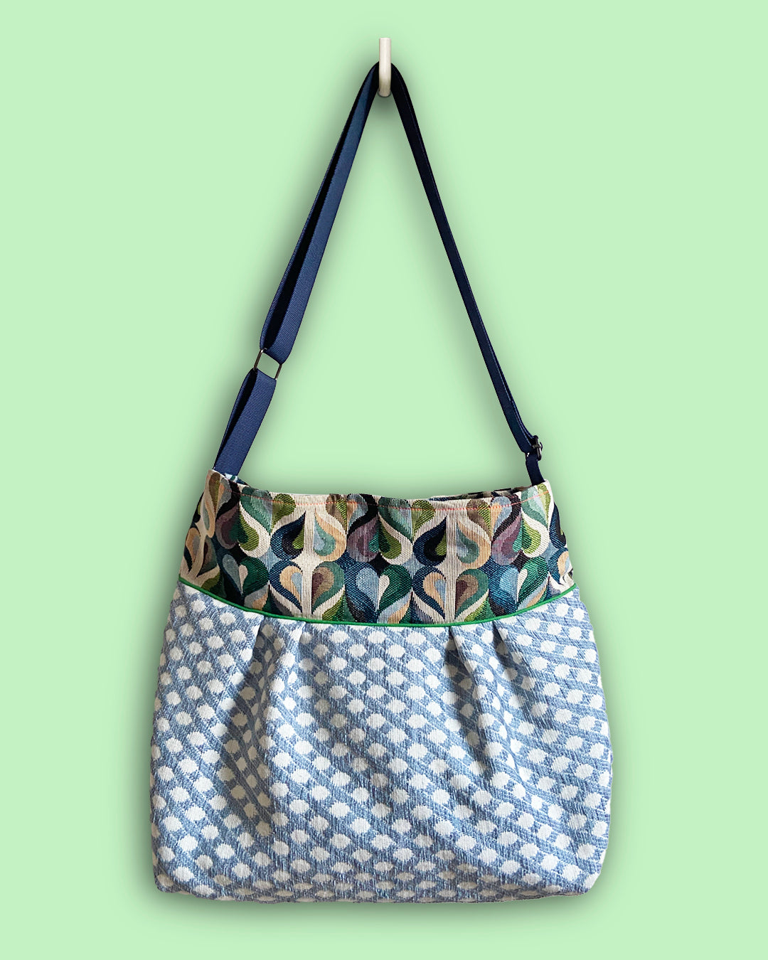 De bovenkant van de tas is gemaakt van een stevige gobelin met een uniek patroon met een retro tintje in tinten van groen en blauw, terwijl de onderkant bestaat uit een zachte wollen stof in lichtblauw met een subtiel grafisch patroon van witte bolletjes. De twee stoffen worden stijlvol gescheiden door een grasgroene piping die het geheel een frisse, moderne uitstraling geeft. Binnenin vind je een voering van wit katoen met vrolijke vlindertjes en stippen in groen en blauw, die perfect aansluit bij het kleurthema en de speelse look van de buitenzijde. Elk detail – van de stoffencombinatie tot de afwerking – is met zorg gekozen om een kleurrijk, stijlvol en origineel design te creëren.
