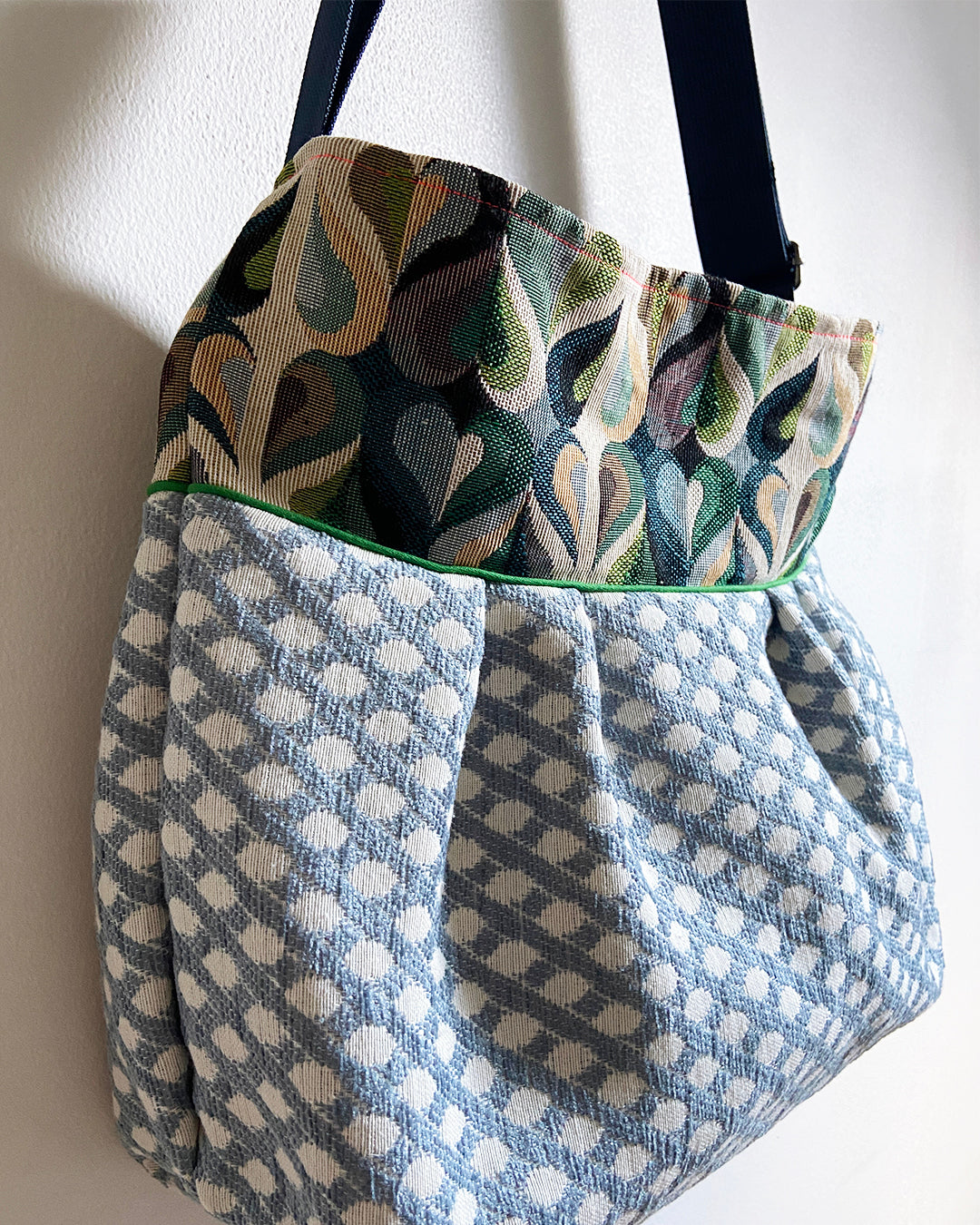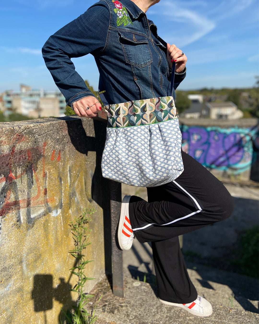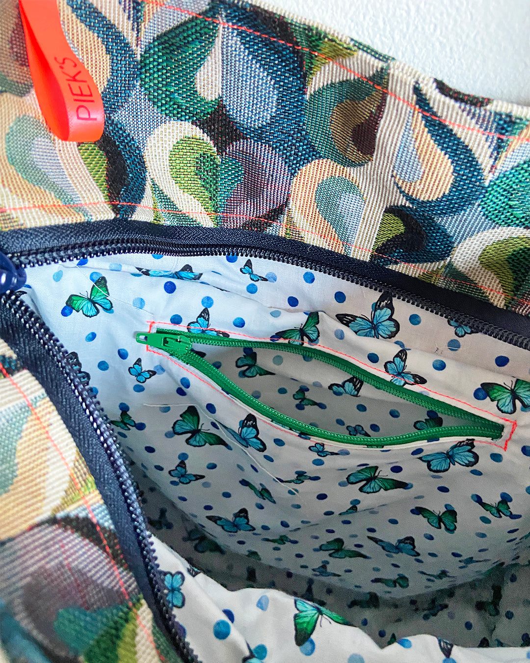 De bovenkant van de tas is gemaakt van een stevige gobelin met een uniek patroon met een retro tintje in tinten van groen en blauw, terwijl de onderkant bestaat uit een zachte wollen stof in lichtblauw met een subtiel grafisch patroon van witte bolletjes. De twee stoffen worden stijlvol gescheiden door een grasgroene piping die het geheel een frisse, moderne uitstraling geeft. Binnenin vind je een voering van wit katoen met vrolijke vlindertjes en stippen in groen en blauw, die perfect aansluit bij het kleurthema en de speelse look van de buitenzijde. Elk detail – van de stoffencombinatie tot de afwerking – is met zorg gekozen om een kleurrijk, stijlvol en origineel design te creëren.