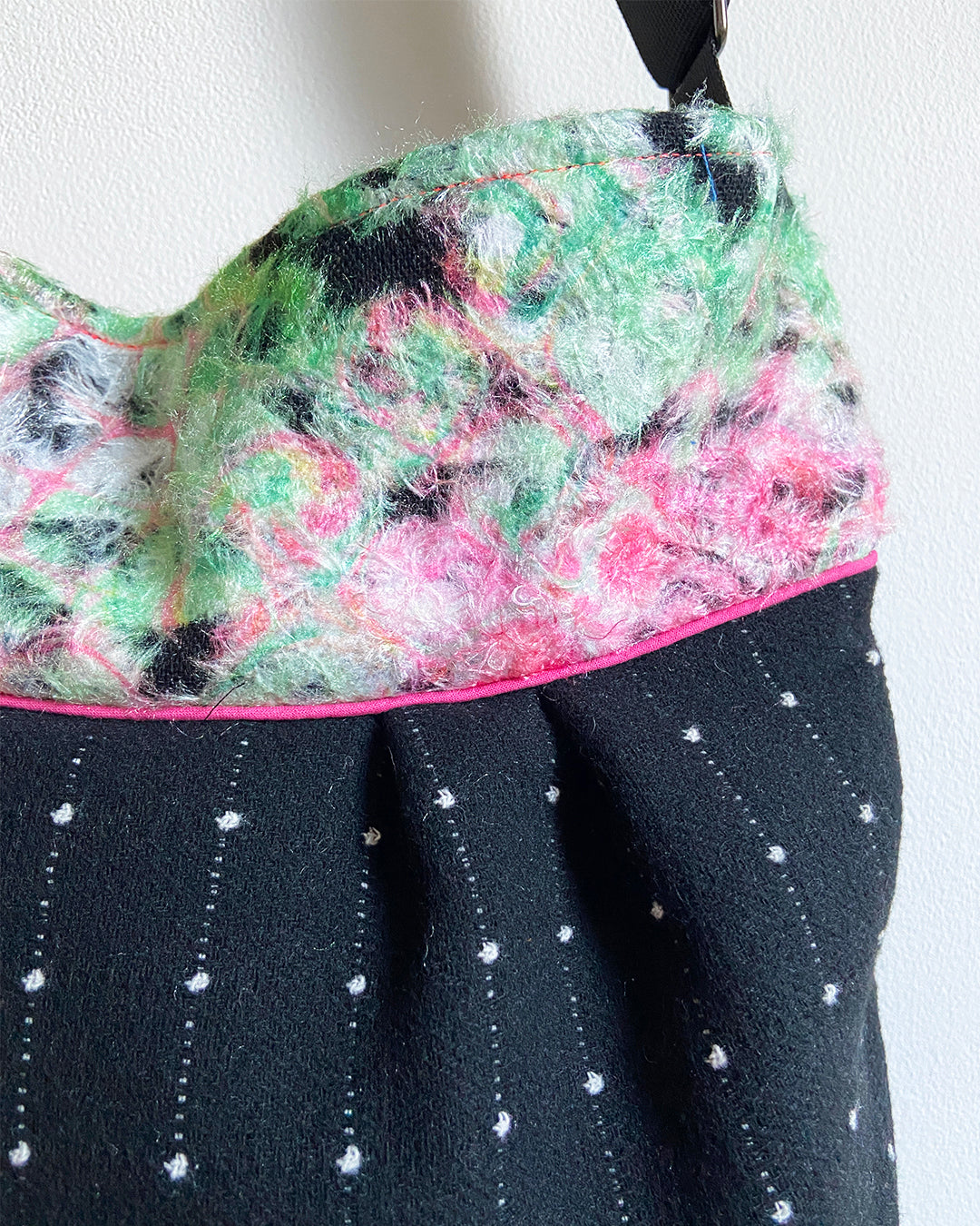 De bovenkant van de tas is gemaakt van een verfijnde vervilte wollen stof met een abstract patroon in lichtgroen en roze, wat zorgt voor een speelse en frisse uitstraling. De onderkant is vervaardigd uit een rijke zwarte wollen stof met subtiele witte stipjes die de tas een elegante diepte geven. Tussen beide stoffen loopt een opvallende roze piping die het ontwerp extra levendig maakt. De binnenkant is gevoerd met een roze katoen met witte stipjes, wat een vrolijk contrast vormt met de buitenkant. De tas is bovendien voorzien van een waterdichte tussenlaag van gecoat polyester, zodat je spullen beschermd blijven — zelfs bij een onverwachte regenbui.