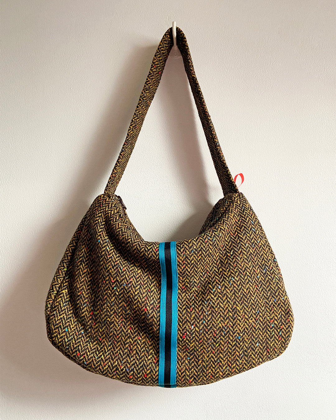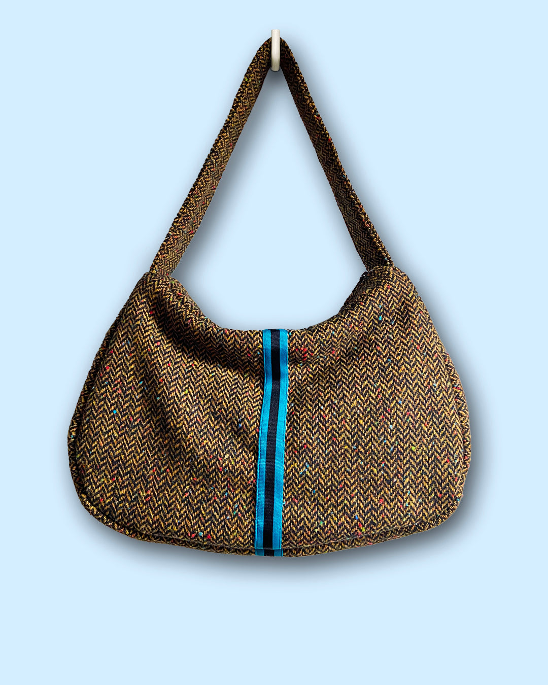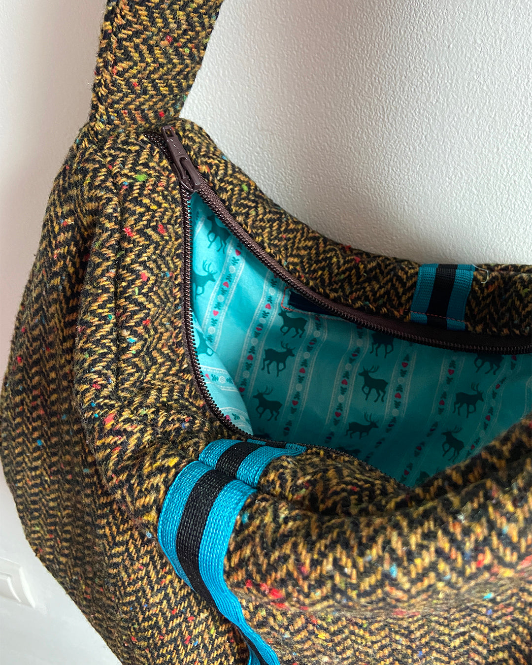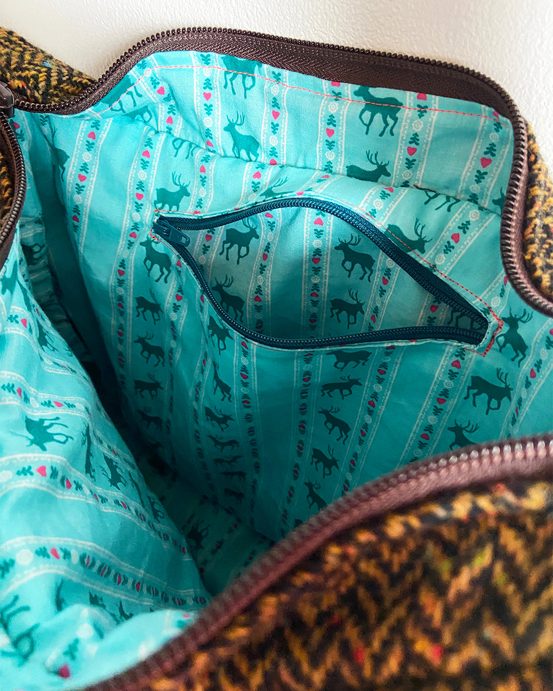 De buitenkant is uitgevoerd in een warme bruine wollen stof met een stijlvolle zwarte chevronprint die doet denken aan een klassieke retro look uit de jaren zeventig. Over de tas loopt een stoere sierband met zwarte en petrol kleurige strepen, wat het geheel een eigentijdse twist geeft. De binnenkant is net zo bijzonder: de cyaan blauwe voering met een speels patroon van elanden en roze hartjes zorgt voor een verrassend en vrolijk accent elke keer dat je de tas opent.