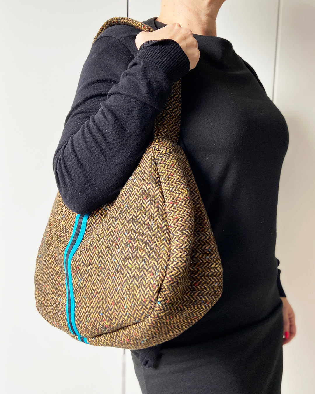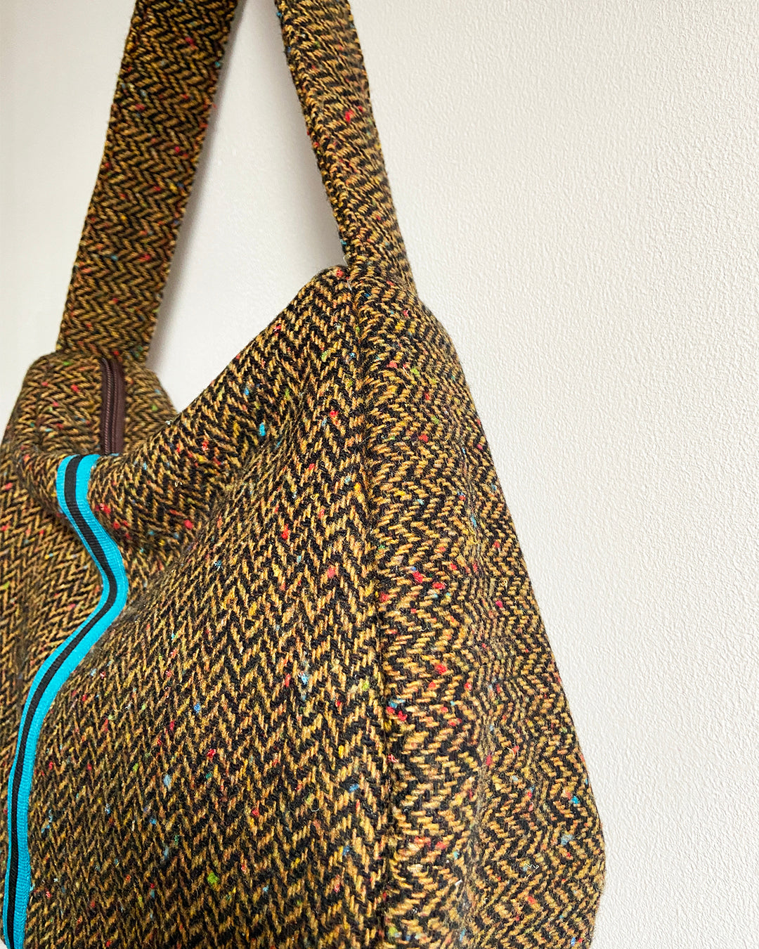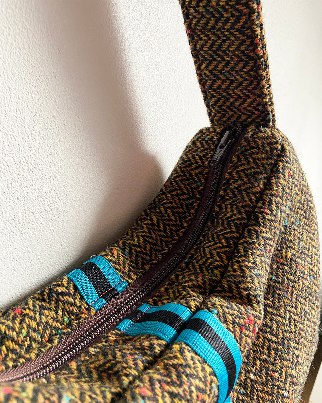 De buitenkant is uitgevoerd in een warme bruine wollen stof met een stijlvolle zwarte chevronprint die doet denken aan een klassieke retro look uit de jaren zeventig. Over de tas loopt een stoere sierband met zwarte en petrol kleurige strepen, wat het geheel een eigentijdse twist geeft. De binnenkant is net zo bijzonder: de cyaan blauwe voering met een speels patroon van elanden en roze hartjes zorgt voor een verrassend en vrolijk accent elke keer dat je de tas opent.