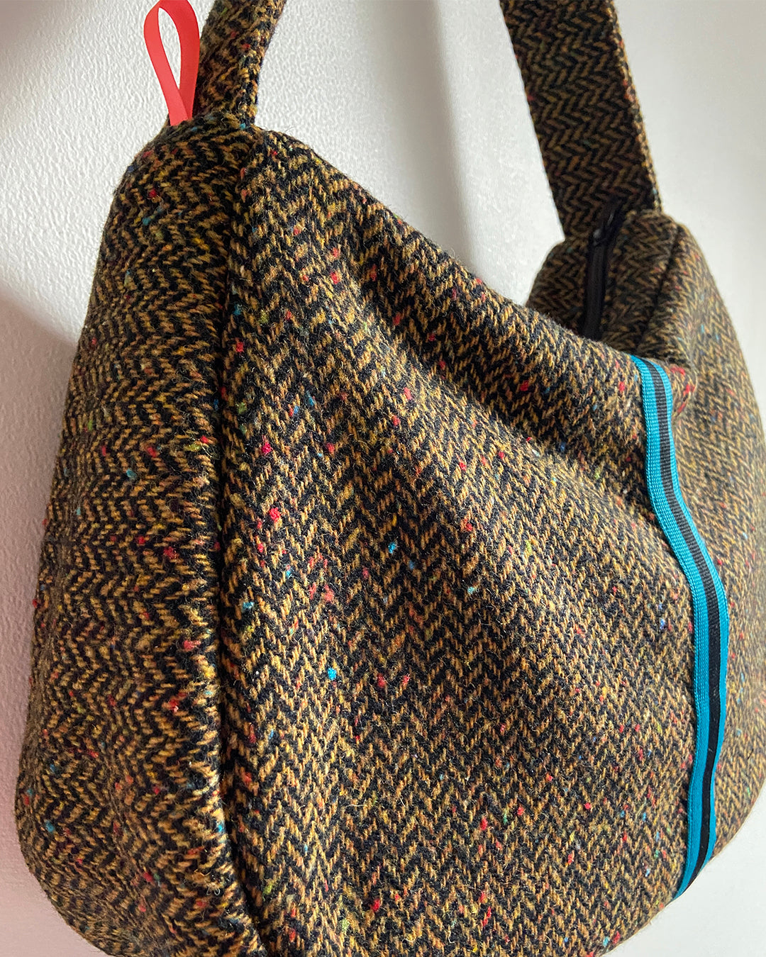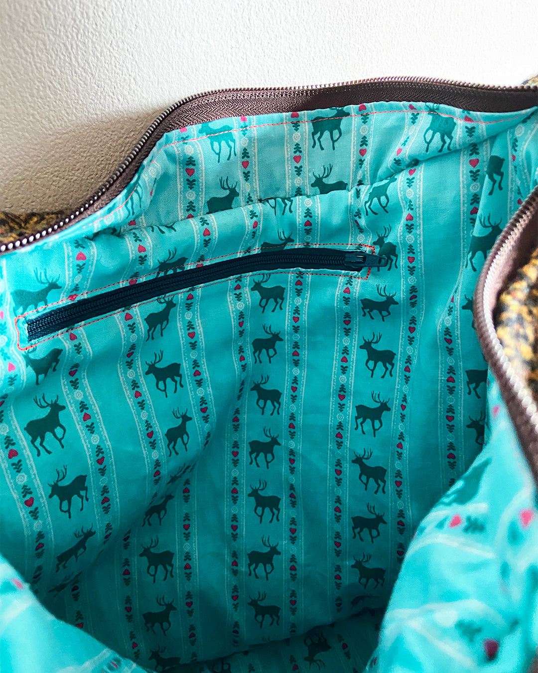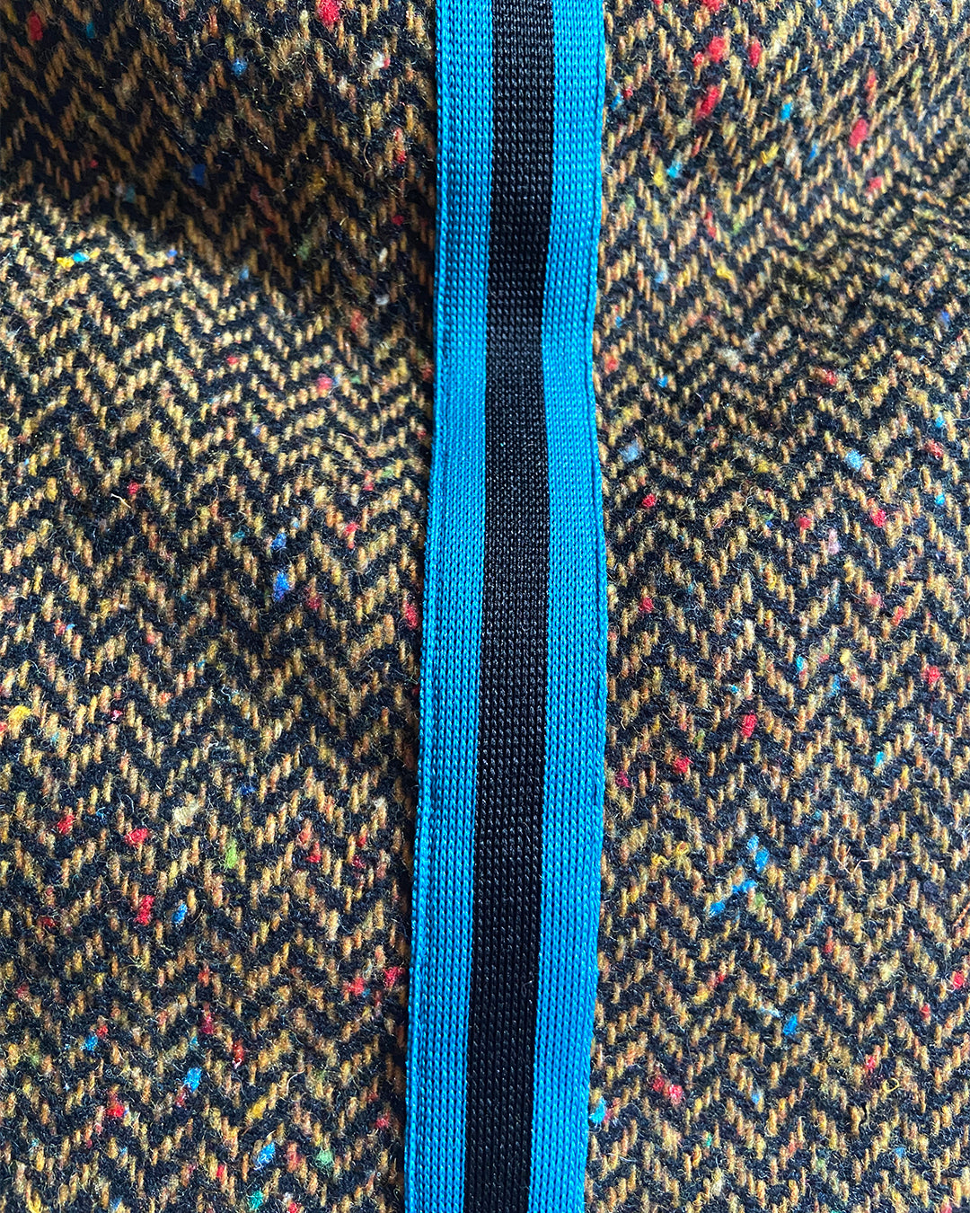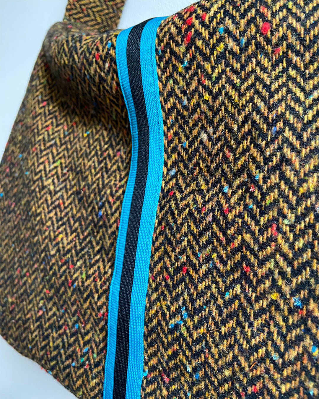 De buitenkant is uitgevoerd in een warme bruine wollen stof met een stijlvolle zwarte chevronprint die doet denken aan een klassieke retro look uit de jaren zeventig. Over de tas loopt een stoere sierband met zwarte en petrol kleurige strepen, wat het geheel een eigentijdse twist geeft. De binnenkant is net zo bijzonder: de cyaan blauwe voering met een speels patroon van elanden en roze hartjes zorgt voor een verrassend en vrolijk accent elke keer dat je de tas opent.