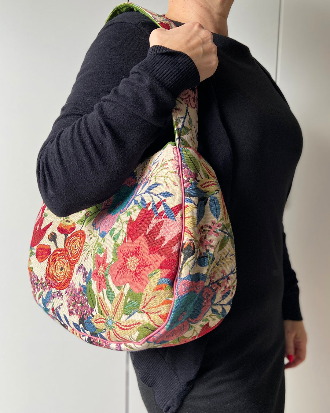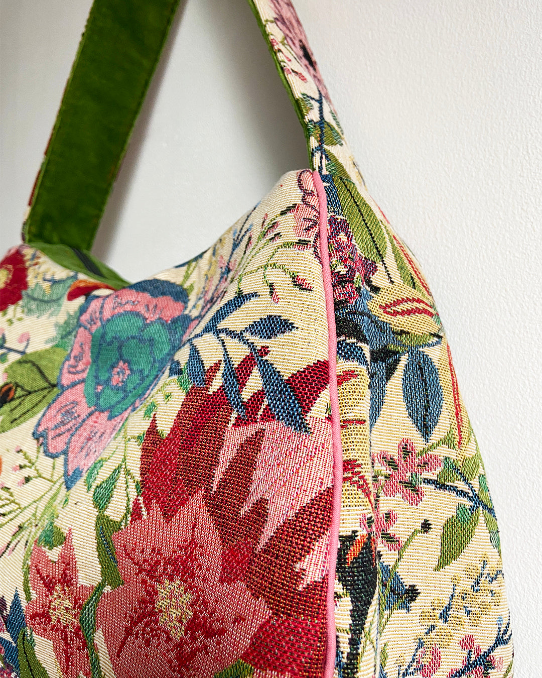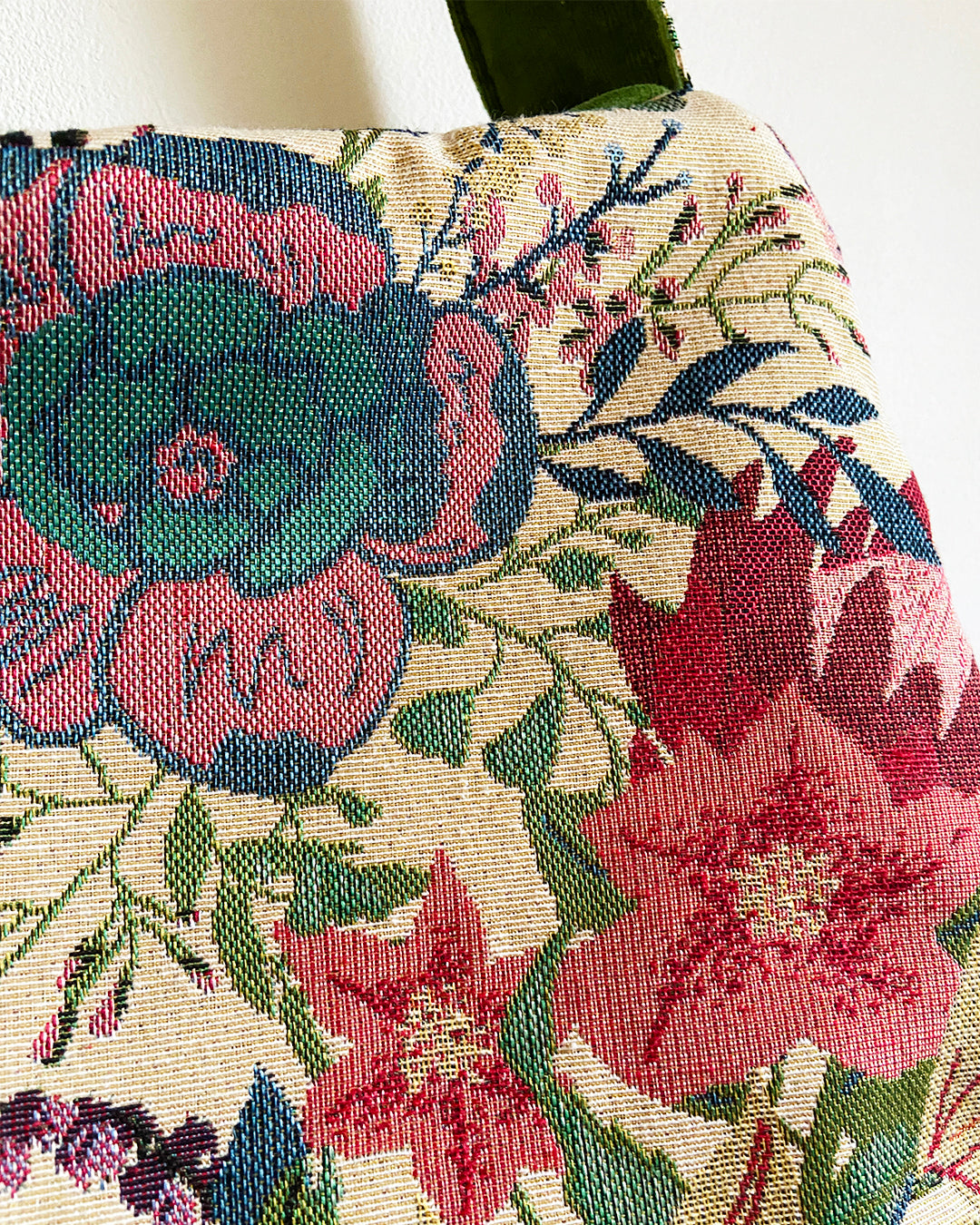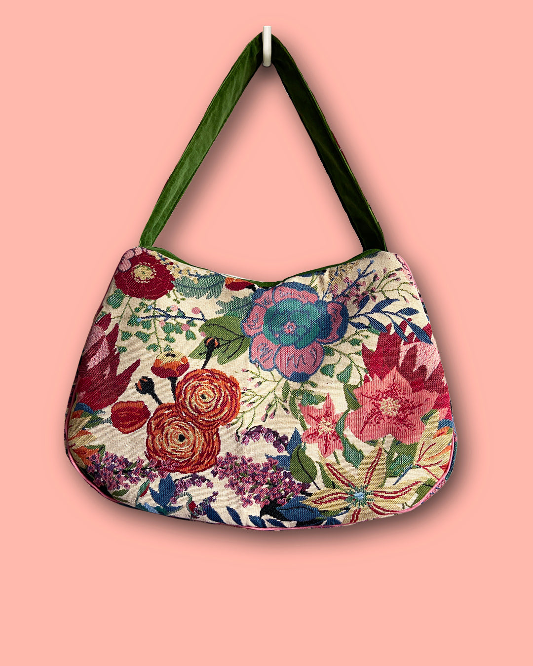 De tas is vervaardigd uit stevige gobelin met een kleurrijke botanische print van grote bloemen, waardoor hij een tijdloze en stijlvolle uitstraling heeft. De bovenkant met ritssluiting en de binnenkant van de brede schouderband zijn uitgevoerd in mosgroen ribfluweel, wat een extra luxe accent toevoegt. De verschillende stoffen worden gescheiden door een oudroze piping, terwijl de voering wit is met een romantische print van lichtblauwe bloemen, waardoor de tas een speels en vrolijk element krijgt.