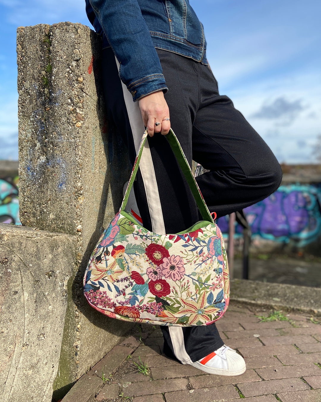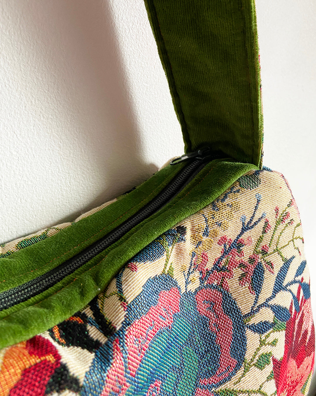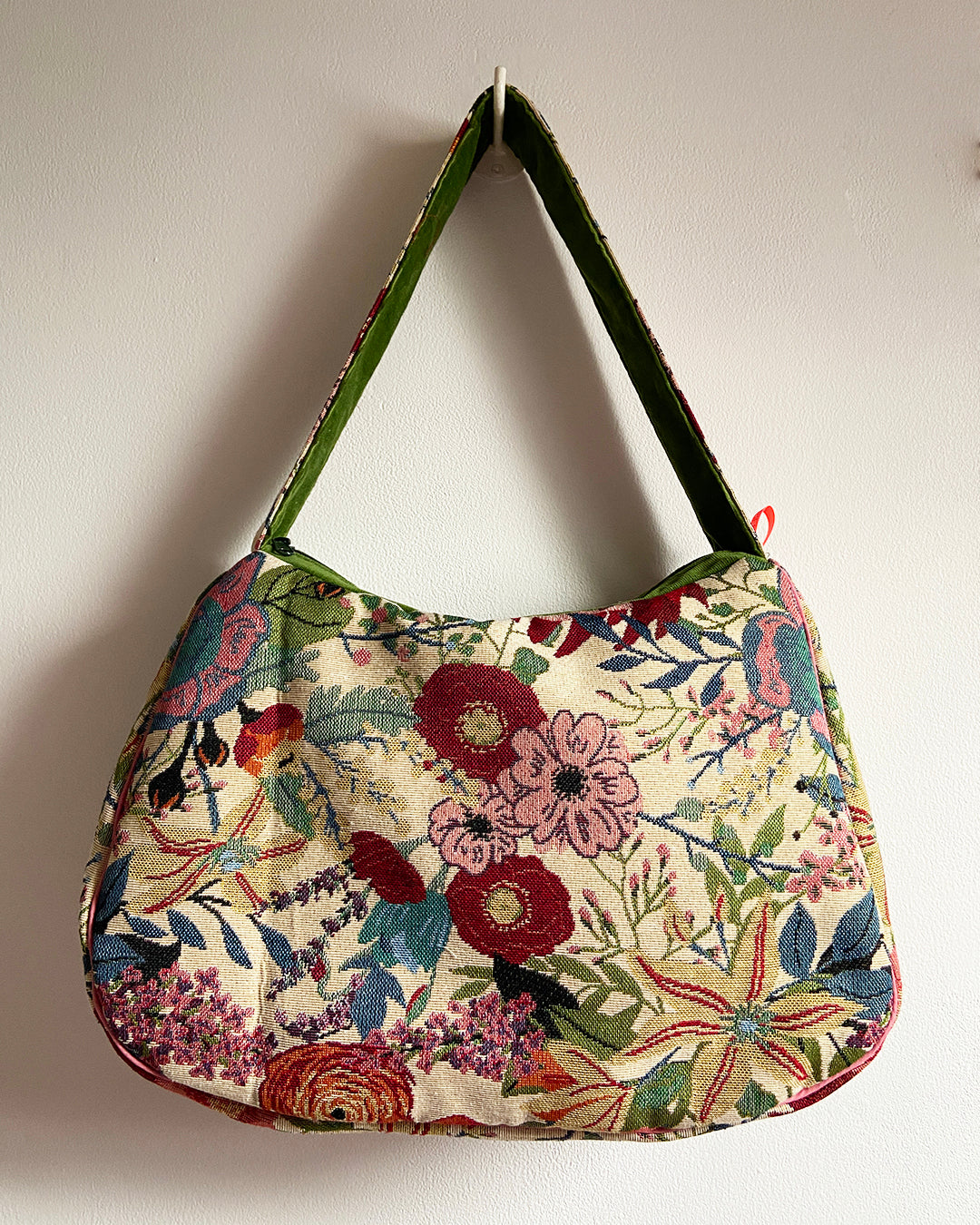 De tas is vervaardigd uit stevige gobelin met een kleurrijke botanische print van grote bloemen, waardoor hij een tijdloze en stijlvolle uitstraling heeft. De bovenkant met ritssluiting en de binnenkant van de brede schouderband zijn uitgevoerd in mosgroen ribfluweel, wat een extra luxe accent toevoegt. De verschillende stoffen worden gescheiden door een oudroze piping, terwijl de voering wit is met een romantische print van lichtblauwe bloemen, waardoor de tas een speels en vrolijk element krijgt.