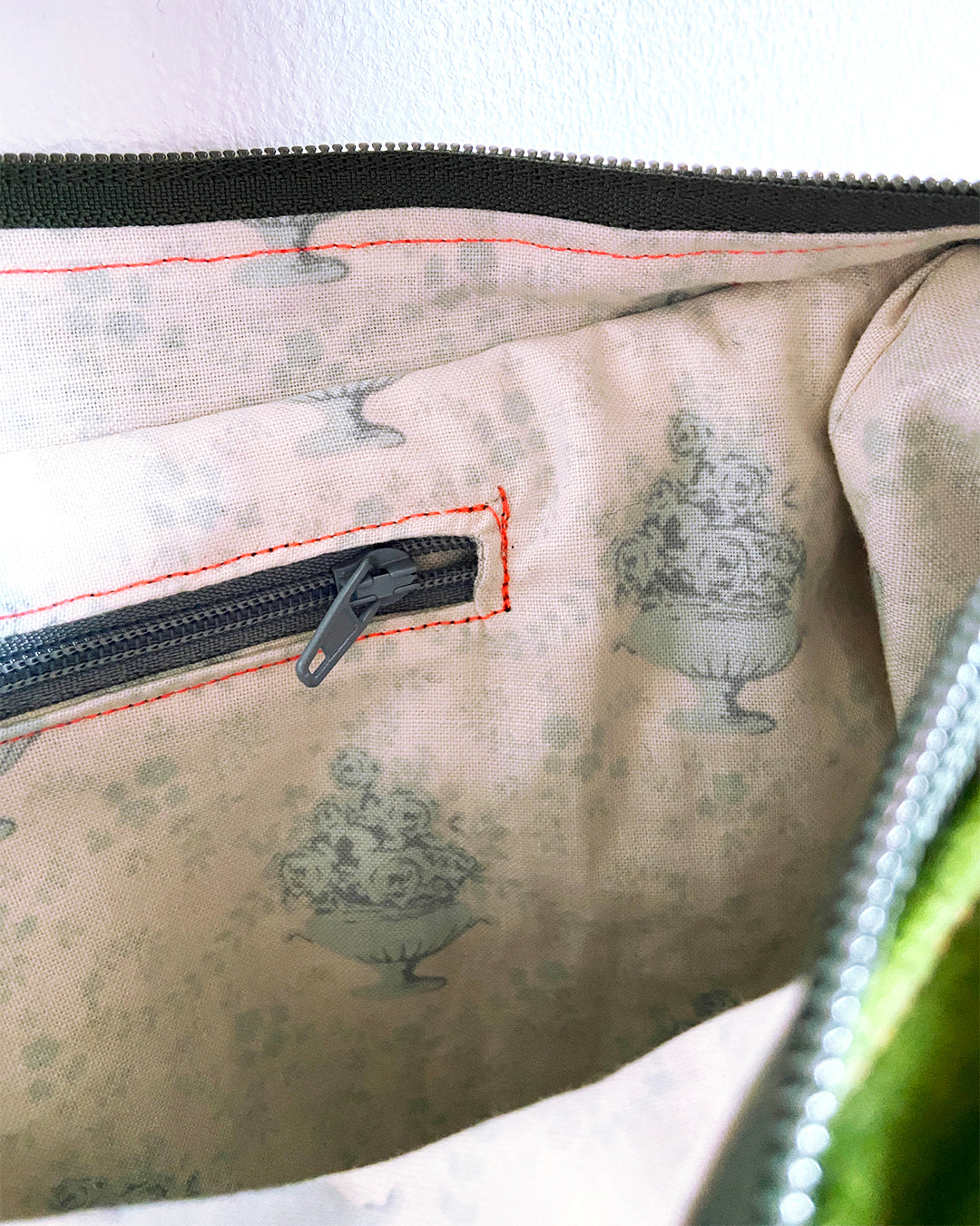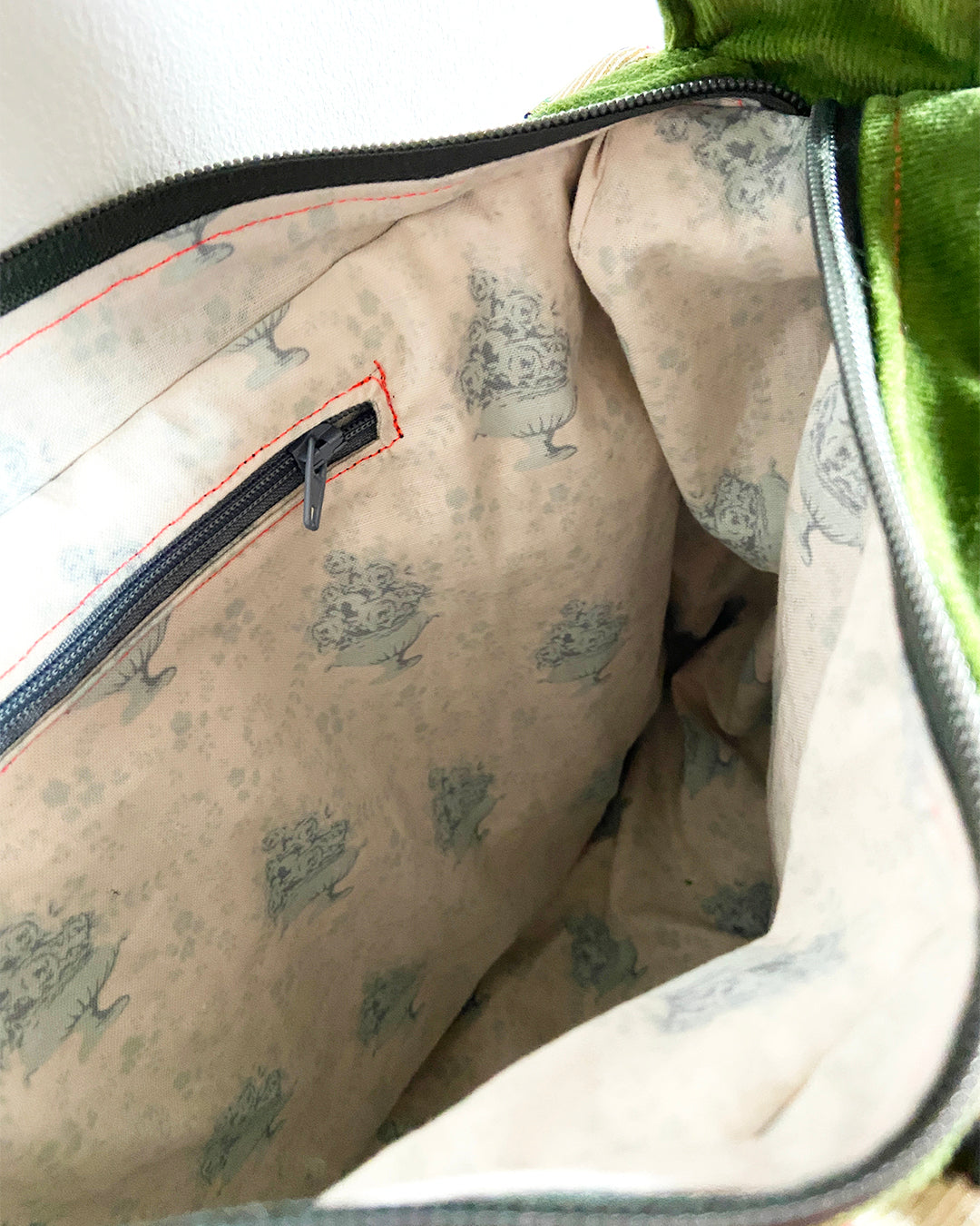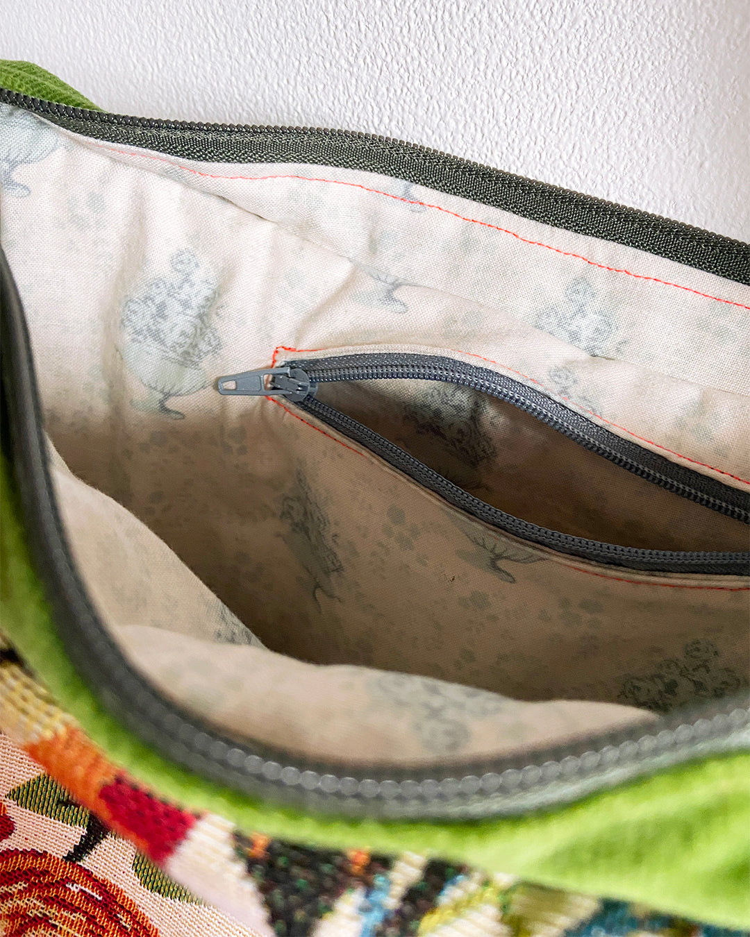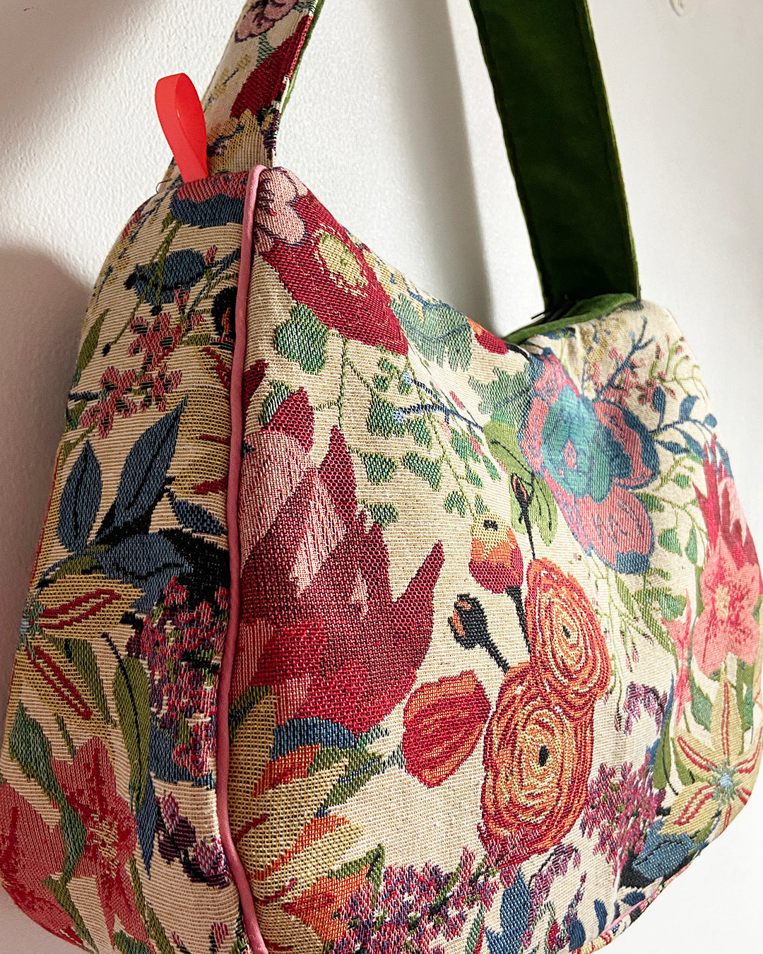 De tas is vervaardigd uit stevige gobelin met een kleurrijke botanische print van grote bloemen, waardoor hij een tijdloze en stijlvolle uitstraling heeft. De bovenkant met ritssluiting en de binnenkant van de brede schouderband zijn uitgevoerd in mosgroen ribfluweel, wat een extra luxe accent toevoegt. De verschillende stoffen worden gescheiden door een oudroze piping, terwijl de voering wit is met een romantische print van lichtblauwe bloemen, waardoor de tas een speels en vrolijk element krijgt.
